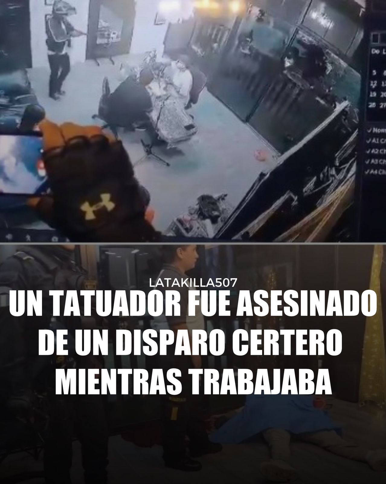 La víctima fue identificada como José Nery Colocho Benavides, de 24 años, conocido como “Nery Hyuston”, quien fue atacado a balazos mientras tatuaba a un cliente en un estudio de tatuajes ubicado en San Cristóbal, Mixco (Guatemala). Cámaras de seguridad captaron el momento del ataque.